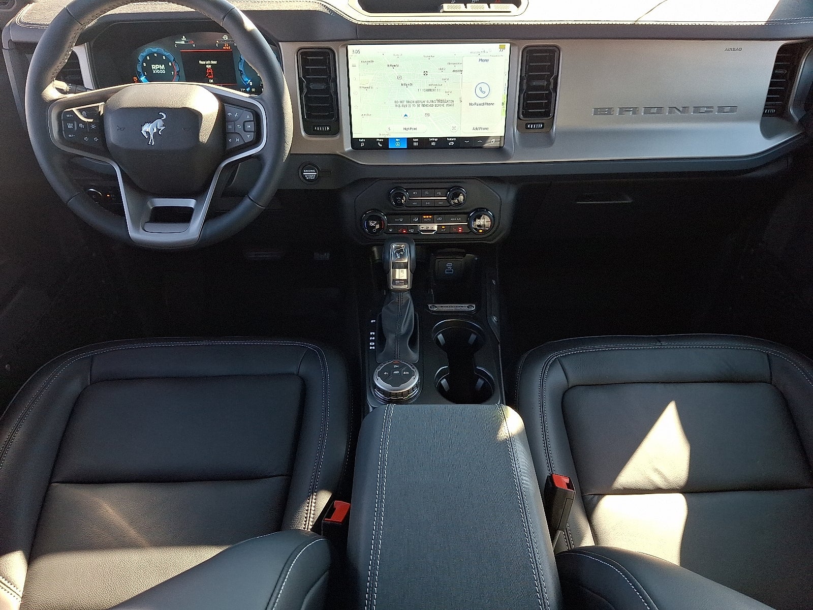 Leather, Navigation, 4WD / AWD, Bluetooth®, SYNC, White Glove Detailed, Rear Camera, 3.73 Axle Ratio, 360-Degree Camera, 4-Wheel Disc Brakes, 7 Speakers, ABS brakes, Adaptive Cruise Control, Air Conditioning, AM/FM radio: SiriusXM with 360L, AM/FM Stereo, Auto High-beam Headlights, Auto-dimming Rear-View mirror, Automatic temperature control, Black Appearance Package, Black Molded-In-Color Door Handles, Black Molded-In-Color Fender Flares, Black Molded-In-Color Sideview Mirror Caps, Black Roof Rails w/Crossbars, Black-Painted Molded-In-Color Grille, Brake assist, Compass, Connected Navigation, Delay-off headlights, Driver door bin, Driver vanity mirror, Dual front impact airbags, Dual front side impact airbags, Electronic Stability Control, Emergency communication system: 911 Assist, Equipment Group 314A Lux Package, Evasive Steering Assist, Exterior Parking Camera Rear, Front & Rear Floor Liners w/o Carpet Floor Mats, Front anti-roll bar, Front Bucket Seats, Front Center Armrest, Front dual zone A/C, Front fog lights, Front Parking Sensors, Front reading lights, Front wheel independent suspension, Fully automatic headlights, Hard Top Sound Deadening Headliner, Heated door mirrors, Heated front seats, Heated Leather-Trimmed/Vinyl Bucket Seats, Heated steering wheel, Illuminated entry, Information on Demand Panel, Integrated roll-over protection, Leather Shift Knob, Low tire pressure warning, Navigation system: Connected Navigation, Occupant sensing airbag, Outside temperature display, Overhead airbag, Overhead console, Panic alarm, Passenger door bin, Passenger vanity mirror, Power door mirrors, Power driver seat, Power passenger seat, Power steering, Power windows, Radio data system, Radio: B&O Sound System by Bang & Olufsen, Rear seat center armrest, Rear-Window Defroster & Washer, Remote keyless entry, Security system, Shadow Black-Painted Hard Top, Sideview Mirrors, SiriusXM w/360L, Split folding rear seat, Steering wheel mounted audio controls, SYNC 4, Tachometer, Telescoping steering wheel, Tilt steering wheel, Traction control, Trip computer, Universal Garage Door Opener, Variably intermittent wipers, Voltmeter, Wheels: 17 Black High Gloss-Painted Aluminum (64X). 2025 Ford Bronco Outer Banks 2.7L EcoBoost V6 4D Sport Utility 4WD Desert Sand Price includes: $2500 - Retail Customer Cash. Exp. 03/31/2026