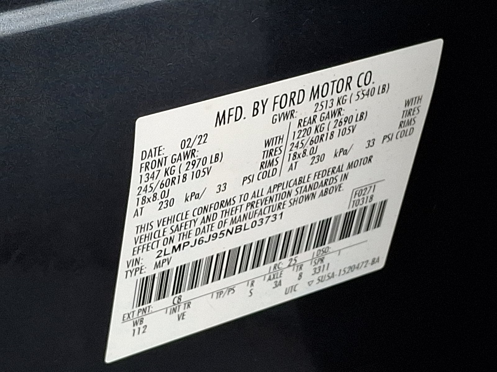 Leather, Extended Warranty Available, Bluetooth®, SYNC, White Glove Detailed, Rear Camera, 10 Speakers, 18 Premium Painted Aluminum Wheels, 3.80 Axle Ratio, 4-Wheel Disc Brakes, ABS brakes, Air Conditioning, Alexa Built-In, AM/FM Radio, AM/FM radio: SiriusXM with 360L, Auto High-beam Headlights, Auto-dimming Rear-View mirror, Automatic temperature control, Brake assist, Bumpers: body-color, Compass, Delay-off headlights, Driver door bin, Driver vanity mirror, Dual front impact airbags, Dual front side impact airbags, Electronic Stability Control, Emergency communication system: 911 Assist, Equipment Group 100A, Four wheel independent suspension, Front anti-roll bar, Front Bucket Seats, Front Center Armrest w/Storage, Front dual zone A/C, Front reading lights, Fully automatic headlights, Heated door mirrors, Heated front seats, Heated Lincoln Soft-Touch Front Captain Seats, Illuminated entry, Knee airbag, Leather steering wheel, Low tire pressure warning, Memory seat, Occupant sensing airbag, Outside temperature display, Overhead airbag, Overhead console, Panic alarm, Passenger door bin, Passenger vanity mirror, Power door mirrors, Power driver seat, Power Liftgate, Power passenger seat, Power steering, Power windows, Radio data system, Rear anti-roll bar, Rear reading lights, Rear seat center armrest, Rear window defroster, Rear window wiper, Remote keyless entry, Satin Roof Rack Side Rails w/o Crossbars, Security system, Speed control, Speed-sensing steering, Speed-Sensitive Wipers, Split folding rear seat, Spoiler, Steering wheel mounted A/C controls, Steering wheel mounted audio controls, SYNC 4 w/Enhanced Voice Recognition, Tachometer, Telescoping steering wheel, Tilt steering wheel, Traction control, Trip computer, Turn signal indicator mirrors, Variably intermittent wipers.